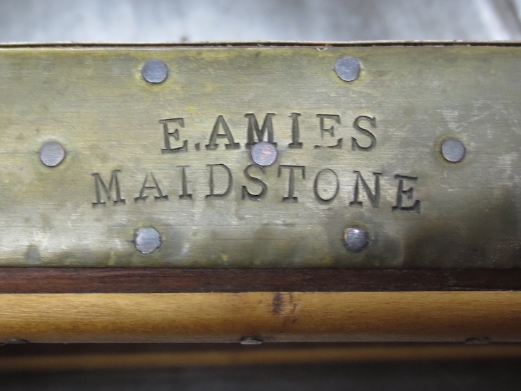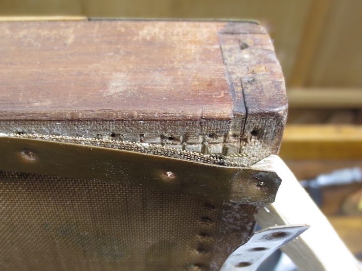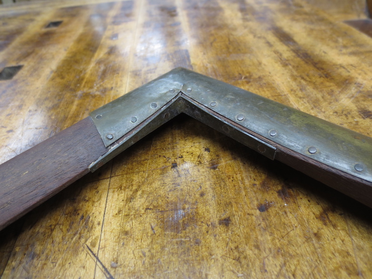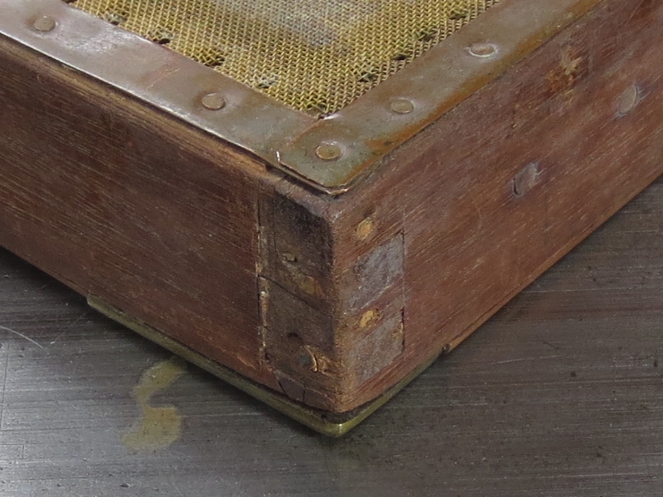 The left front corner of the deckle has a brass plate inset into the vertical inner edge. It is bent at a right angle and nailed into a shallow mortise. There was also an “L” shaped flat brass plate that was set down into the groove behind the deckle rim. Now it is missing. Both front corners also have bent brass plates along the very narrow vertical face of the rim. These ‘wear plates’ are standard features on most British moulds I’ve seen.
