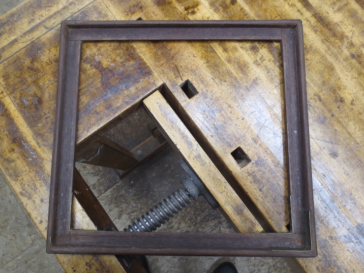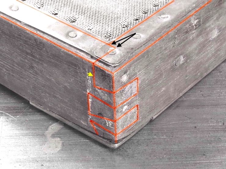 The red lines show what the edges would look like if the facing and edge strips were removed. The yellow arrow shows the offset and the black arrows point to the extra joining surface that is created on the right hand part of the mould frame. This little ledge would keep the mould frame (on the left) from being pushed in at the top. That’s the theory I’ve come up with to explain the function of the extra feature. There must be some reason to do it this way since it makes cutting the joints a little more difficult.