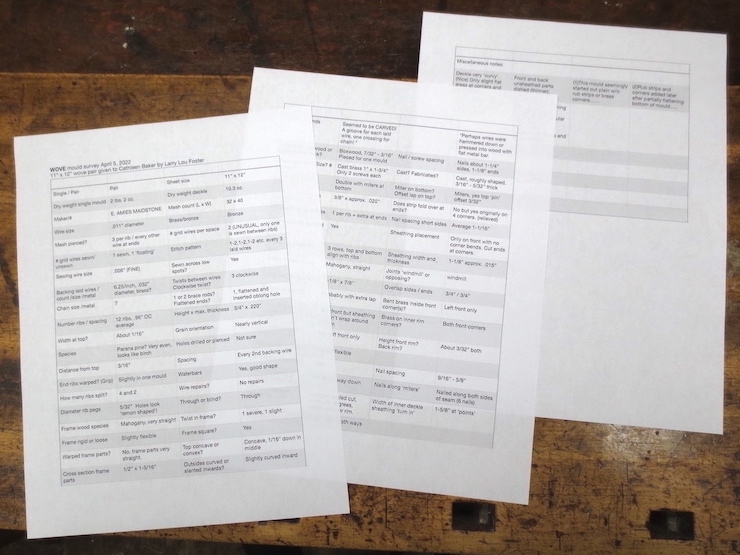 I have not carefully examined a lot of moulds and deckles. I thought I should get organized to make it easier to note features and variations. The survey that I devised ended up describing about 75 features that I am interested in recording for comparison. I first print blank versions with only the questions to complete by hand. Then I enter the information for a digital record. Pictured is a completed survey of this pair of moulds.