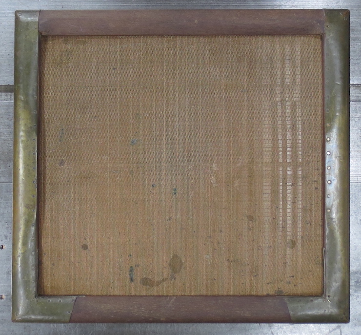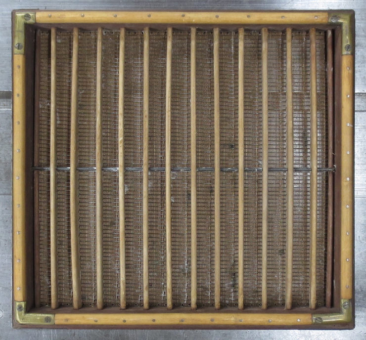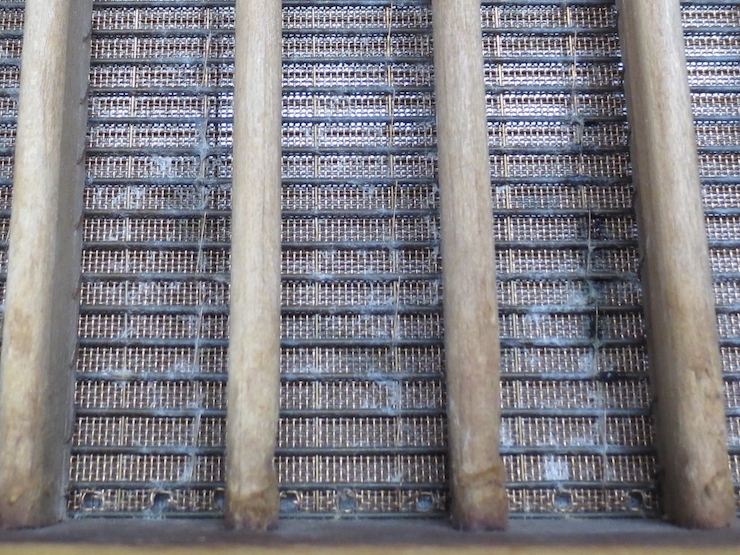 One of the moulds has a decided twist, though the mahogany sides are all very straight (as is the grain of the wood). Both moulds are slightly concave; the metal screen sags by about 1/16″ in the middle. This may be a result of the long term stresses of couching. The photo shows the back side of the mould where the pegs of the ribs are visible. These moulds have ‘through holes’ and the pegs formed on the rib ends pass all the way through the frame. The entire front of each mould is sheathed. The sheathing ends right at the two front corners and is not folded around the sides. You can see this in the previous photo.