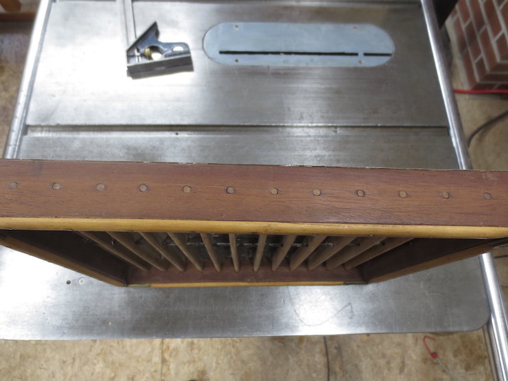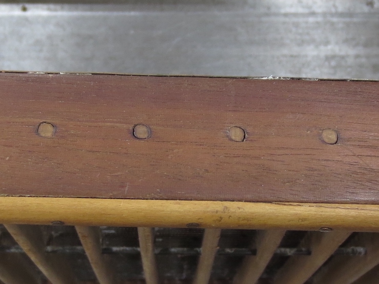 Mystery #1: Why are all of the holes that the rib pegs rest in uniformly ‘lemon shaped’? And why are they oriented the same way? I can imagine that a file or a sort of broach must have been used to shape the holes. If anyone has any insights please share!
