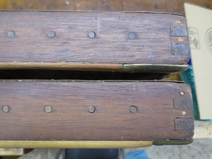 The moulds have been altered and/or re-conditioned. They seem to have started out (as many small moulds do) plain, without rub strips and brass corners. This is indicated by the remains of a miter partly hidden beneath each of the eight brass corners. A miter (combined with the regular joint) is a traditional way to neatly finish the bottom corner of a plain, unbraced mould. Corner braces and rub strips were added later, possibly because the mould was wearing badly on its bottom edges. The narrow copper strips that protect the edges of the wire facing were originally folded down over the ends and nailed. The current edge strips stop just shy of the corners. You can see the two holes left when the nails were removed and also an area which was carved out of the wood to accept the thickness of the original strips. The joints seem to be nailed and countersunk; filled holes appear on both faces of each corner. Also interesting is this variation of the double dovetail joint in which the top ‘pin’ (this refers to the part that overlaps the ‘tails’ in dovetail joints) is offset by about 3/32″. My guess is that this was intended to add strength to the end of the frame. Gripping the mould to the deckle during formation might tend to pull the bottom edge out, thus torquing the top edge inward; in this case the inward thrust would be stopped by the narrow ‘ledge’ cut into the adjoining (long) side of the frame. (This is illustrated more clearly at the bottom of this post).