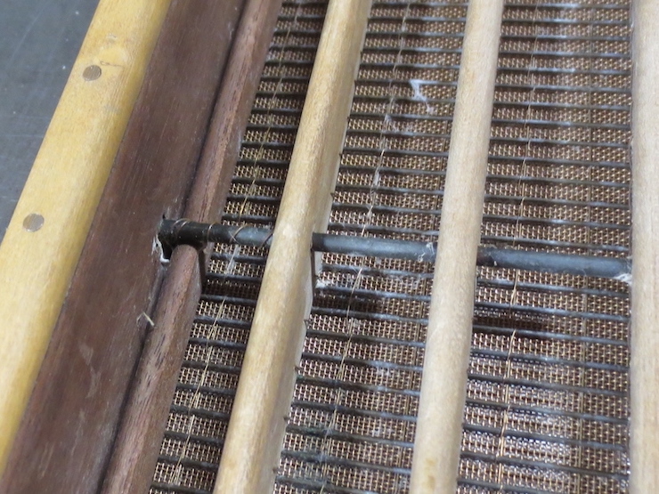 I was gratified to see that the stitches are carefully placed to ‘lie low’ by crossing the mesh wires at the low points as they spiral around the backing wires. (Gratified because I sometimes wonder if I imagined this detail; it seems such a fine point and may or may not be a common feature). The sewing wire is unusually small at .006″ diameter and the mesh wire is relatively coarse at .011″ diameter. The mesh is fairly coarse at 36 wires per inch by 40 wires per inch. The 4 stitches visible in this close-up are indicated by blue arrows. The path of a floating grid wire is shown by the yellow arrows. Ideally this grid wire is held in a sort of ‘trough’ formed by a pair of zig-zagging mesh wires; here you can see that this wire wanders off to the right a bit.