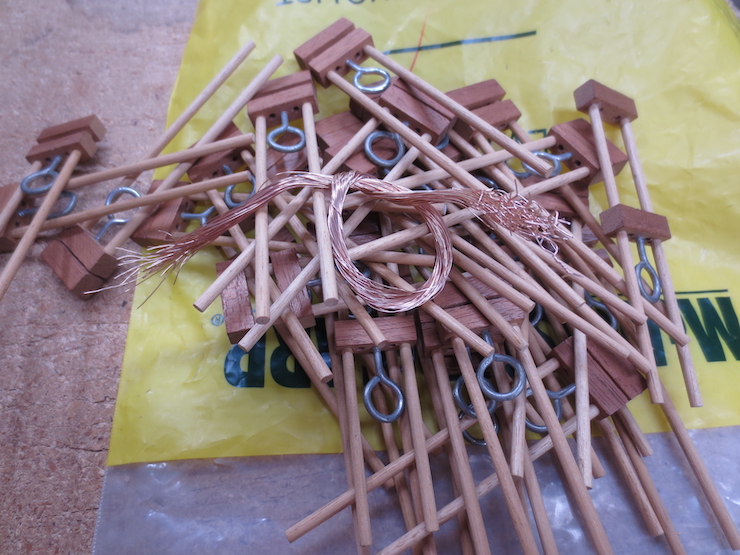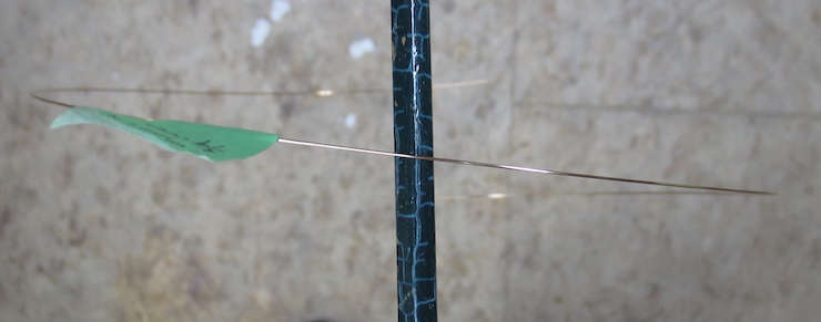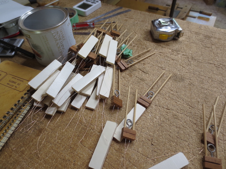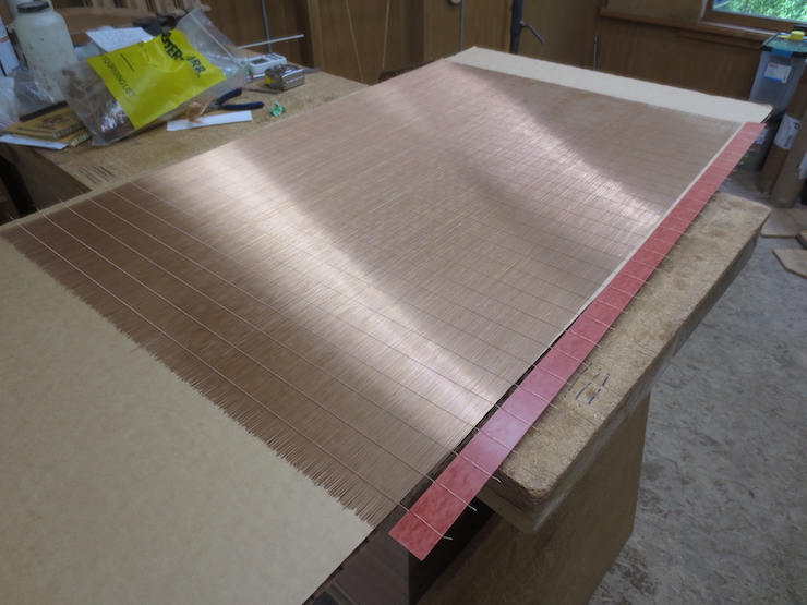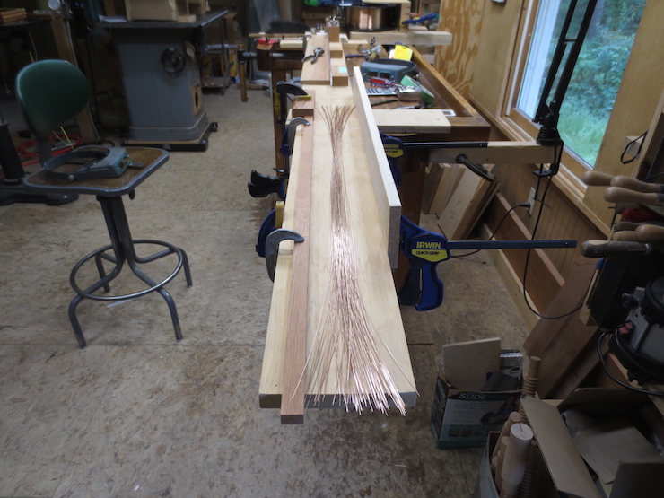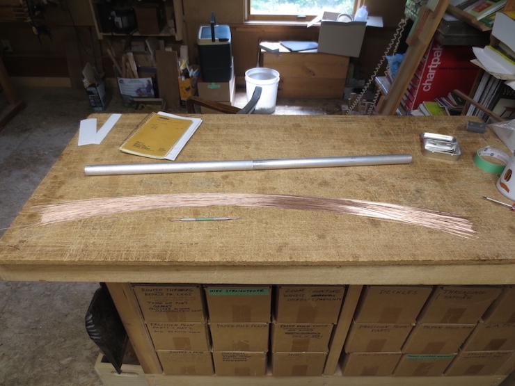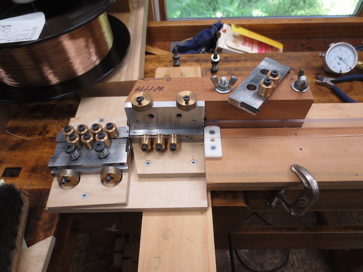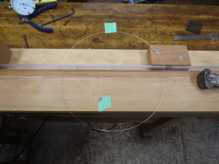 A complete circle cut from the spool shows a ‘cast’ of 8″ diameter. This ring of wire lies flat by its own weight; the ‘helix’ is minimal. It would be impossible to use this tightly curved wire for laid wires but just below it you can see a usable wire (from the same stock) which has been pulled through the straightener. This wire is .020″ diameter phosphor bronze with a 3/4 hard temper. It will be used along with annealed .011″ diameter wire (as chain wire) to make a facing with 22 laid wires per inch.