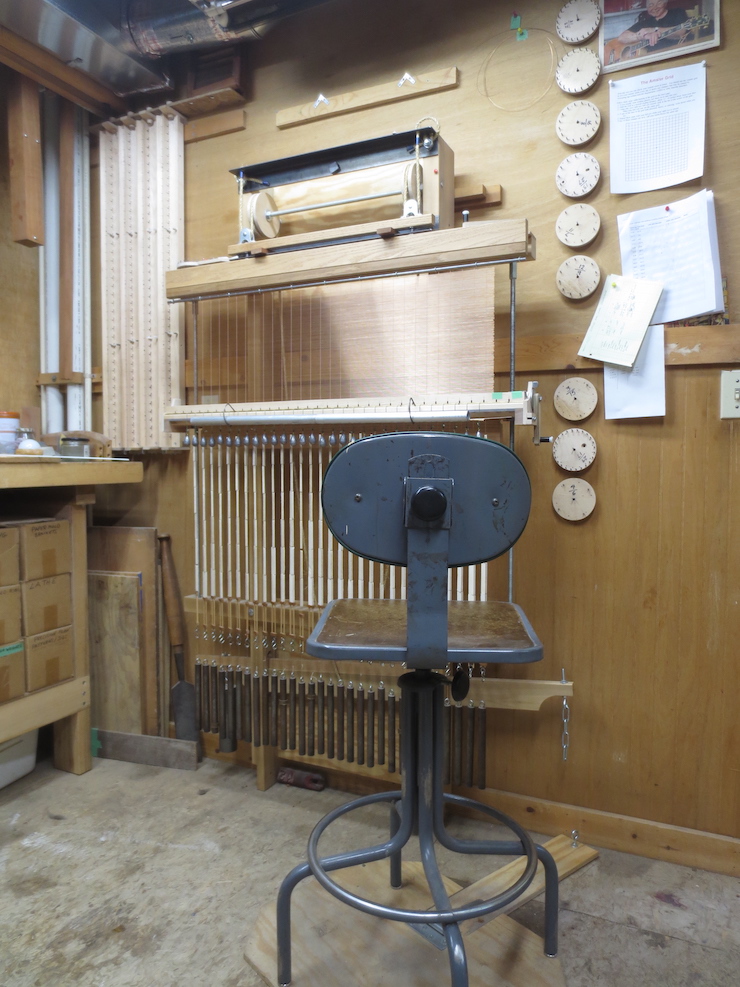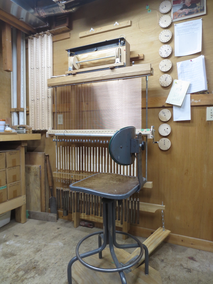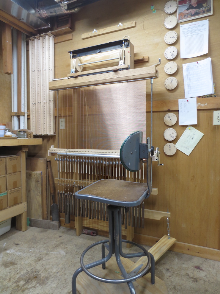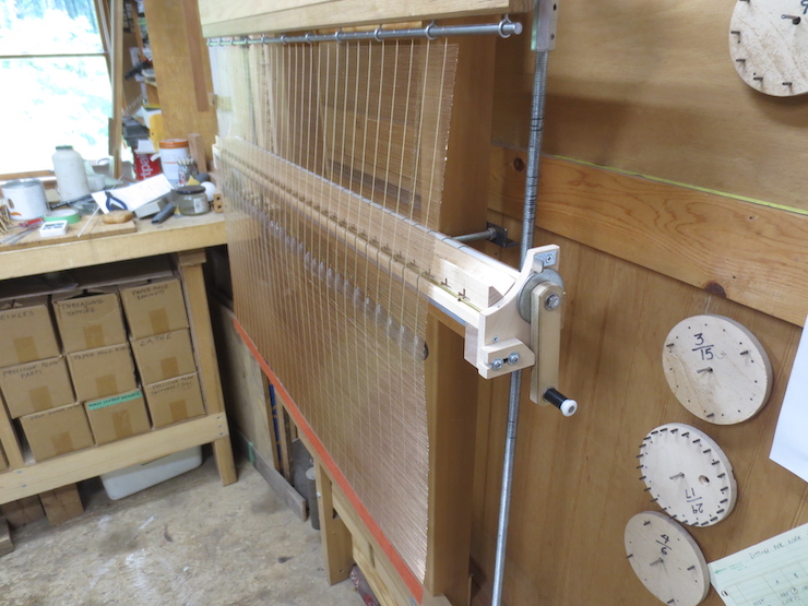 Above, the 22 pin counting wheel in place on the loom. As the disc rotates the pawl slips off of the pins creating audible clicks that can be counted to produce a desired laid wire spacing.