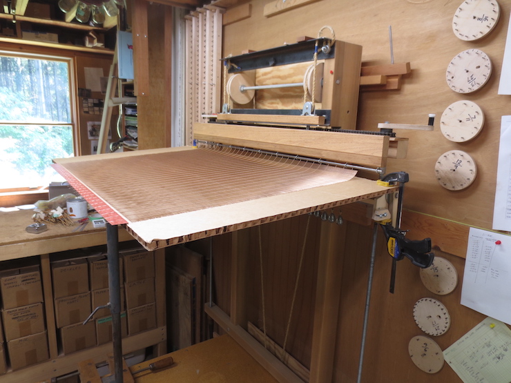 This facing has 22 laid wires per inch. It took me quite a while (years in fact) to realize that this loom can easily make laid facings with an even number of wires per inch. At first I used a limited number of counting wheels and the spacings were all odd fractions (except for 26 wires per inch, easily made by giving the crank 1/2 turn).