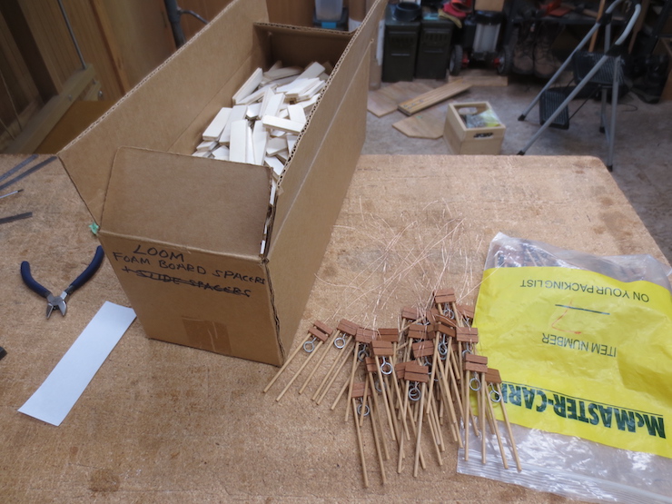 Above are shown some steps in creating the facing. At the beginning the loom has been strung up with 30 chain wire sets, each formed of a single soft phosphor bronze wire draped over the steel rod at the top, threaded through spindles and weighted at the bottom. Wire spacers made of foam board (300 in all!) are important to keep the wire from twisting up at the bottom as the spindles add twists at the top. As the facing grows larger and the twisting head descends, these wire spacers are removed, a row at a time. The last photo shows the completed facing. At first it is best to work standing but later when the wires must be inserted lower it becomes easier to sit (thus the stool).