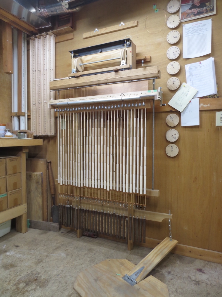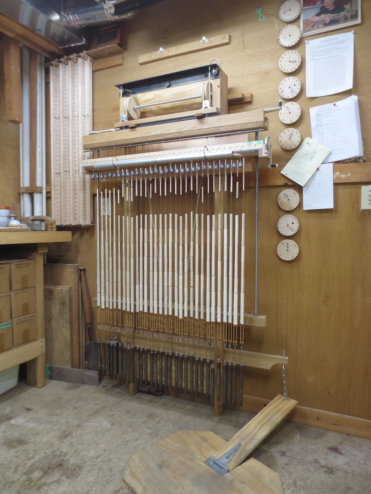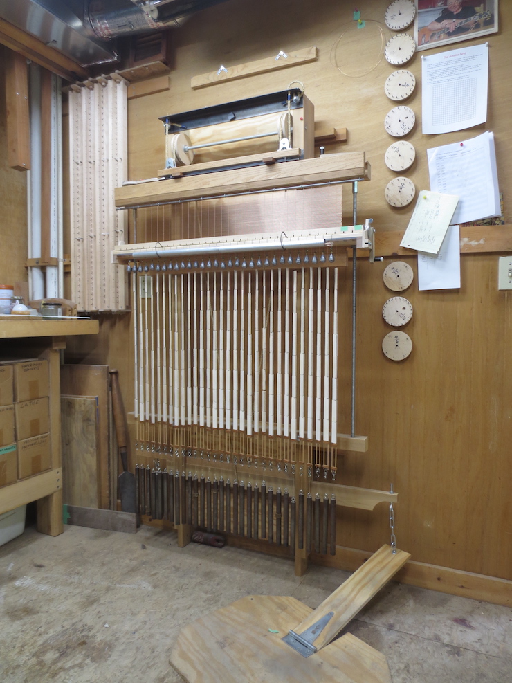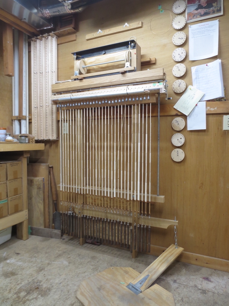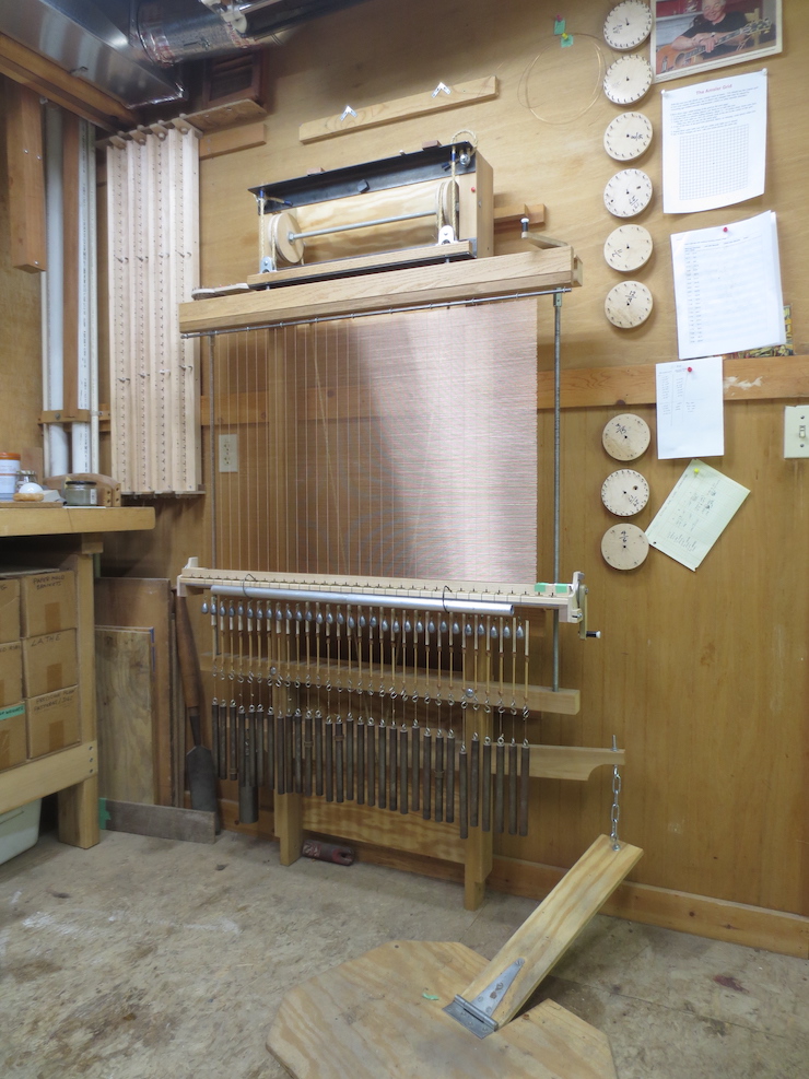 This loom is very dependable. I’ve made improvements over the years to reduce the chance of error while making up facings, but a certain level of concentration must be maintained and it’s still possible to goof up. Large facings are a little stressful since making a mistake often means starting completely over. Set-up for this facing took 3-1/2 hours. This involved swapping out the twisting mechanism already on the loom for another of the correct spacing, adding the spindles and hooking up drive weights, measuring out, stringing up and weighting chain wires, and putting all the foam board spacers in place. (Many of these steps are illustrated in other posts). This facing was completed without incident but the actual ‘weaving’ took 4-1/2 more hours.