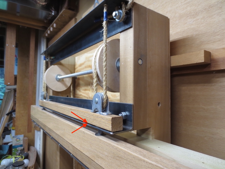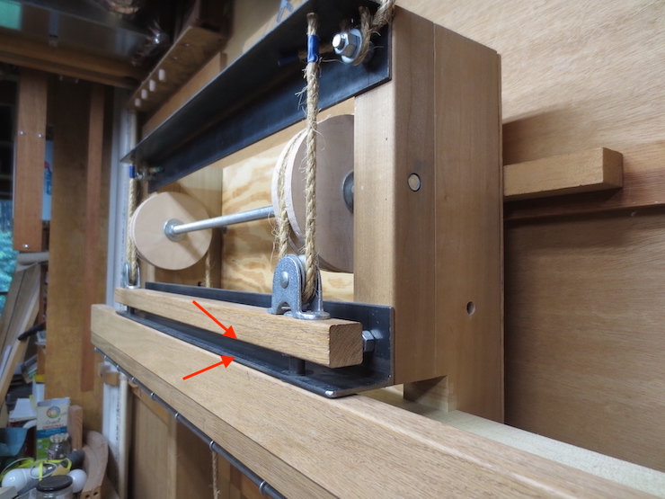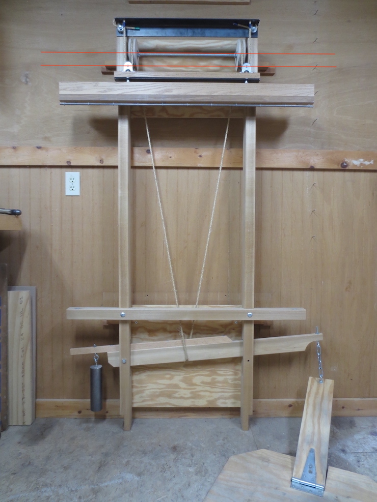 In both photos above the upper line (red) passes through the (fixed) axle of the wooden pulleys and the lower line passes through the axles of both steel pulleys (movable). Hopefully this makes it easier to see that the metal pulleys (and the beam they are attached to) move up and down when the treadle is depressed and released.