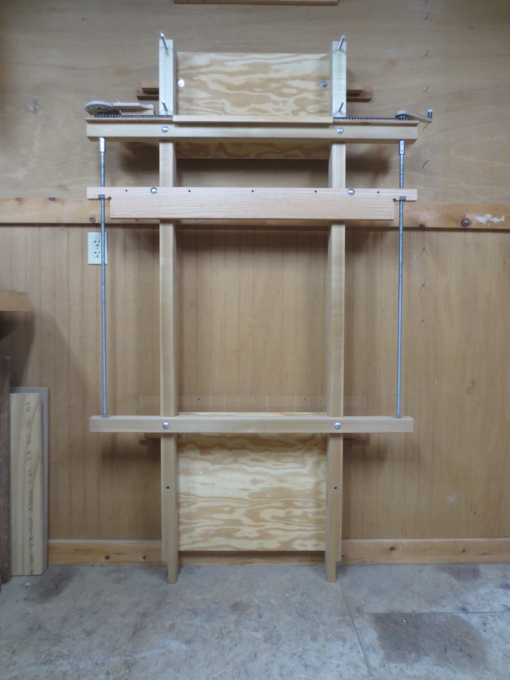 Here is the loom frame stripped of all of the moving parts which are normally attached to it. Two mechanical assemblies will be fastened directly to this frame; the lift mechanism and the laid wire indexing mechanism. The third mechanism, the one that twists the chain wires, is not attached directly to the frame. The loom is fastened to the wall in the photo. This takes up much less space than the free-standing option.