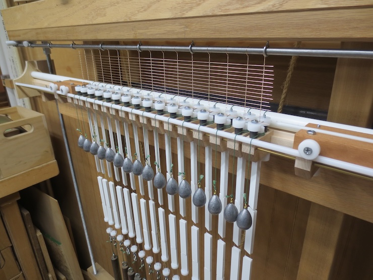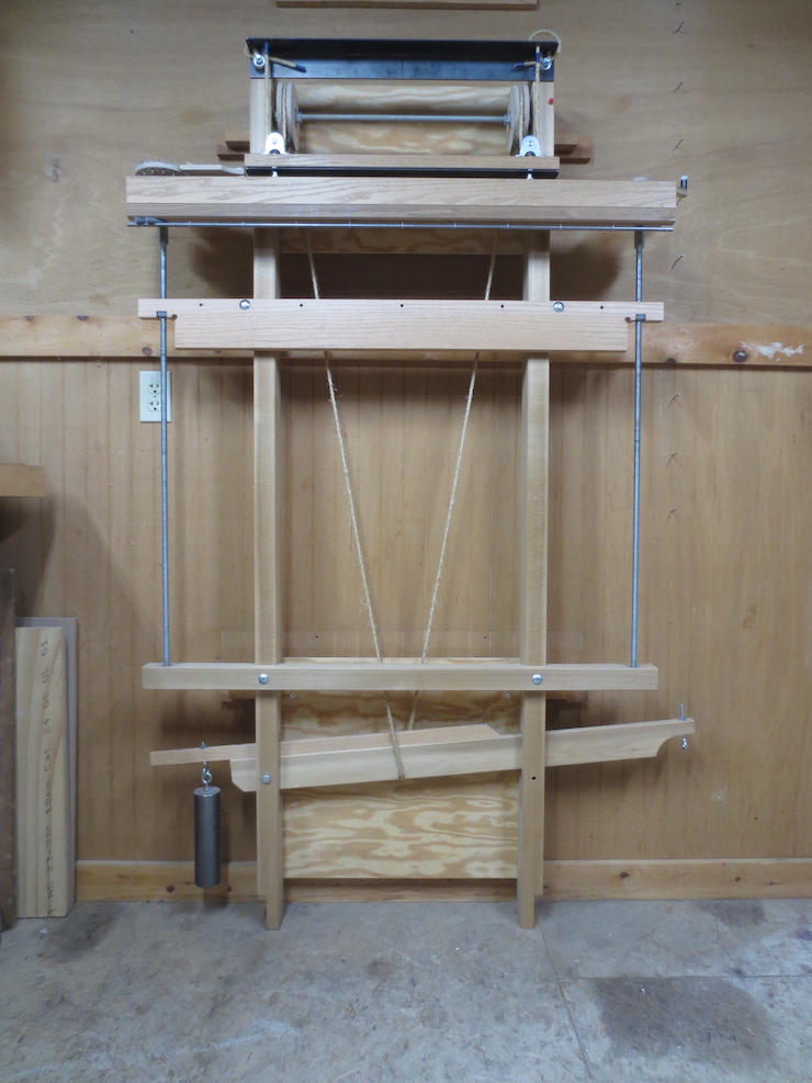 Above are shown the two positions of the lift mechanism, up and down. When the foot treadle is depressed (a brick supplies the force here just to demonstrate) the lifting beam at the top is raised by means of rope and pulleys. The middle of a length of rope passes under a lever which is attached to the treadle on the right. This creates a V shape with two upper ends. Each of these (rope) ends passes up and over the top of a wooden pulley, then down and through a metal pulley and back up to the very top of the loom where it is firmly attached. The inch or so that the rope is pulled down by depressing the treadle lifts the beam and all the wire and weights attached to it a half inch. The lift beam returns to the lower position when the treadle is released.