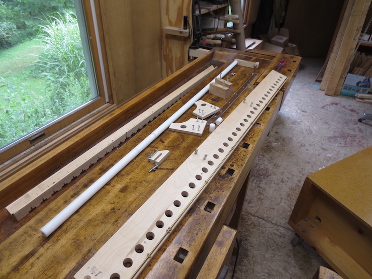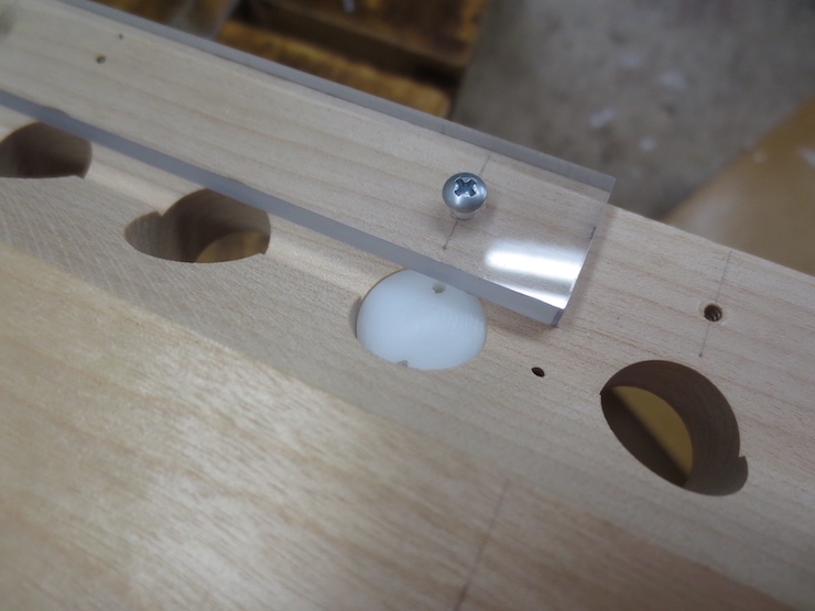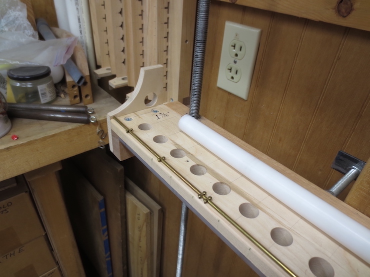 A strip of polycarbonate screwed to the bottom prevents the spindles from dropping through the holes and provides a slippery surface for them to turn on. These holes were bored with a 5/8″ forstner bit and the spindles had to be turned down a bit on a lathe to turn freely. A simpler method is described at the end of the post.