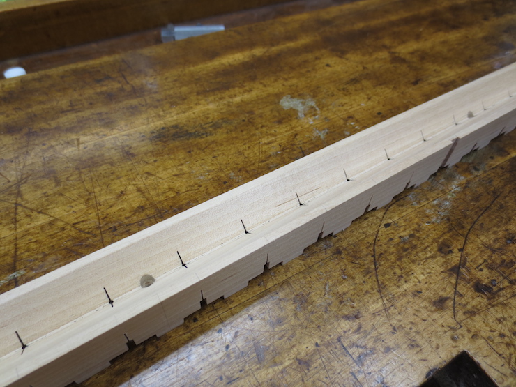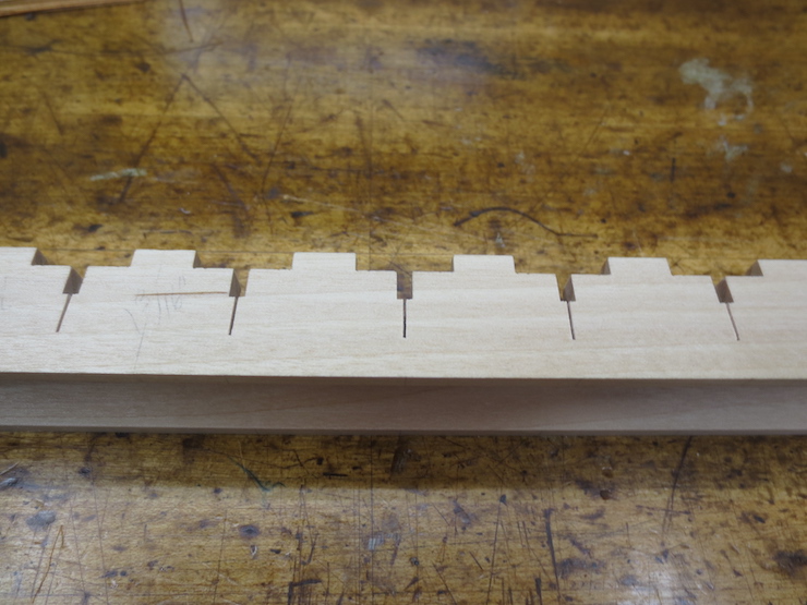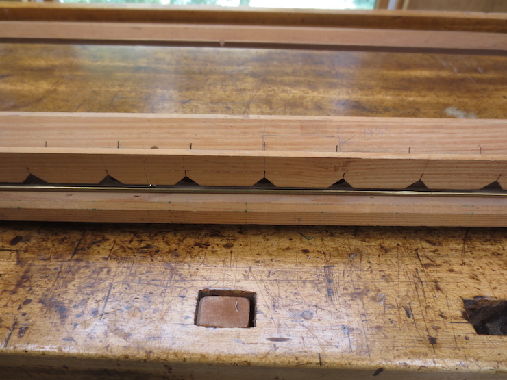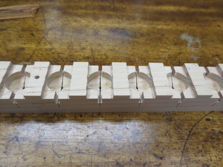 The trough lying on its side. The very narrow saw cuts were made with a Japanese style backsaw held in a cross-cut jig.