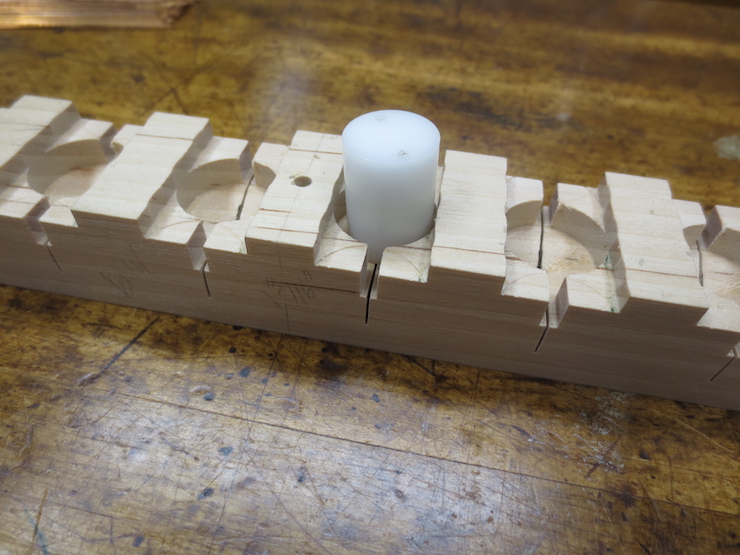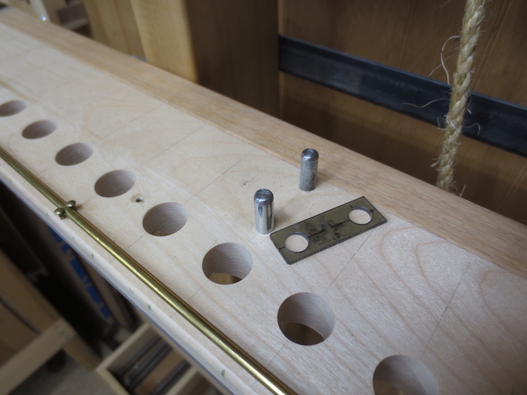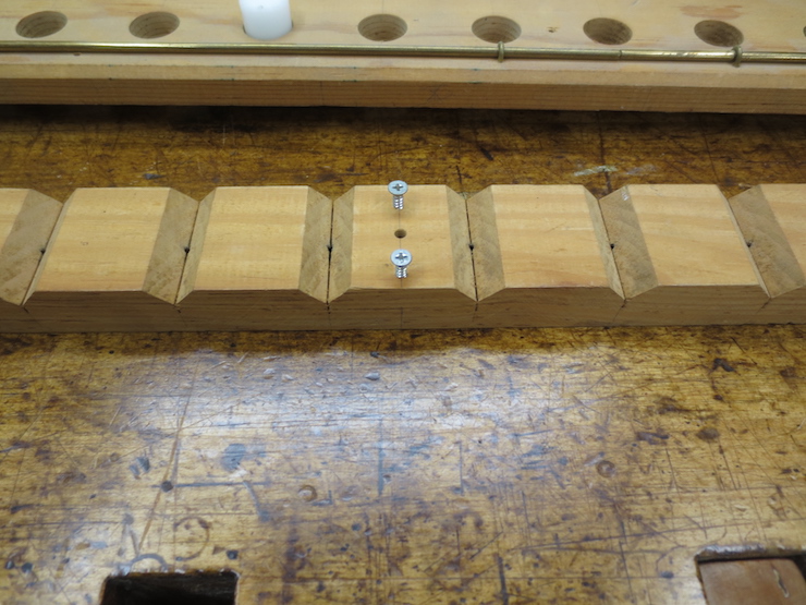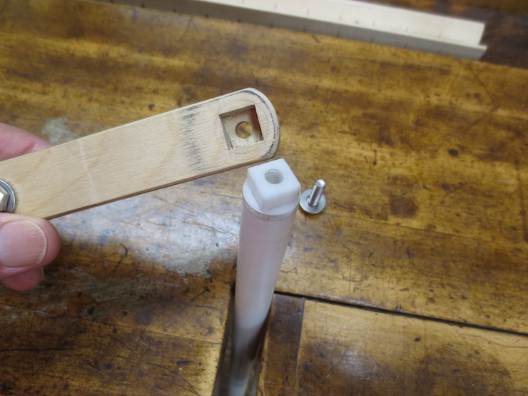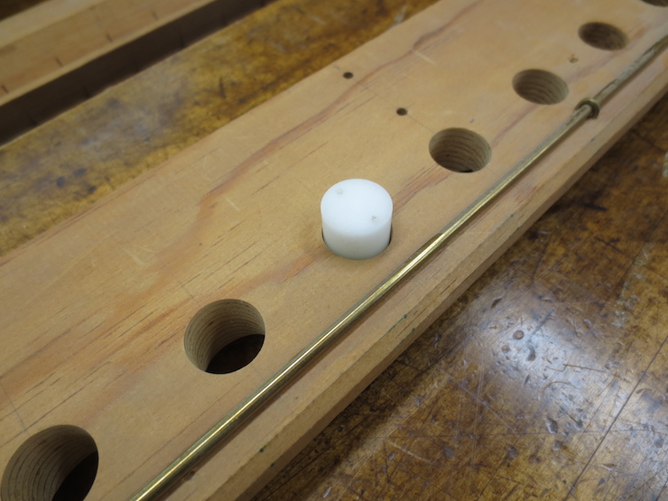 These were also made of pine which has some advantages. The original spindles were cut from 5/8″ diameter acetal rod and filed smooth on the ends. (I didn’t have a lathe). This material is manufactured slightly oversize so the 5/8″ holes drilled in the wood fit too tight. The holes were easy to enlarge with a strip of coarse sandpaper and dowel chucked into an electric drill. As you can see above the spindles can be quite loose.