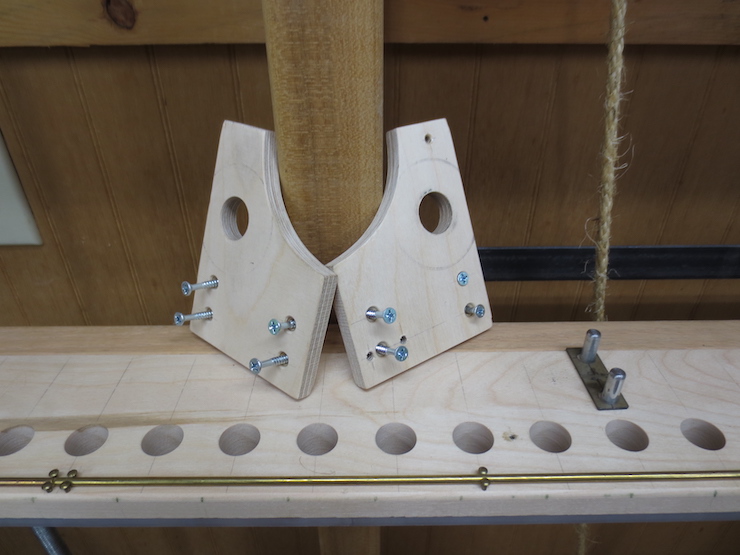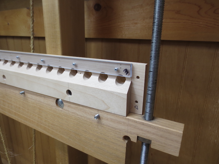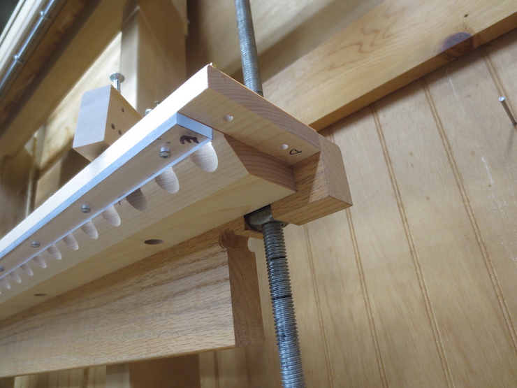 The partially completed spindle rack can now be fastened to the loom; specifically to the traveling beam of the indexing mechanism. The dark colored spot is one of five acetal ‘plugs’ sunk into holes. They are cross-drilled and tapped to receive the threads of the machine screws. Two of the five machine screws are visible here.