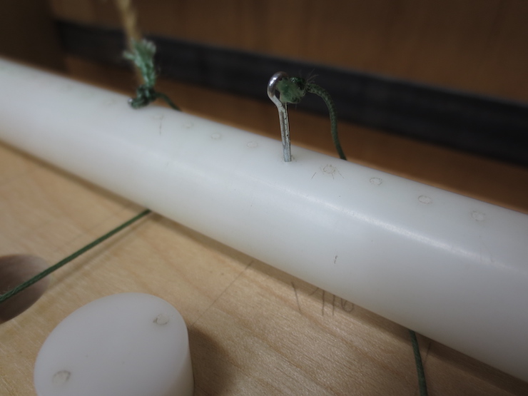 The ends of the cotter pins should start at the back and end up in the front when the weights are cranked up fully. This way the pins and knots stay on top as the reel is turned back and forth. The purpose of the 1/8″ brass rod fastened along the front is to elevate the cords at the front of the spindles. This prevents the cord loops from lapping over each other.