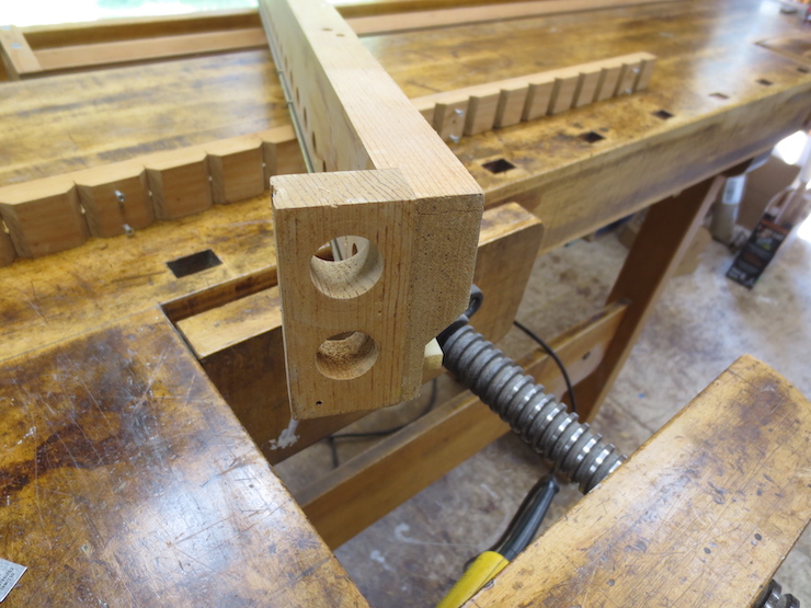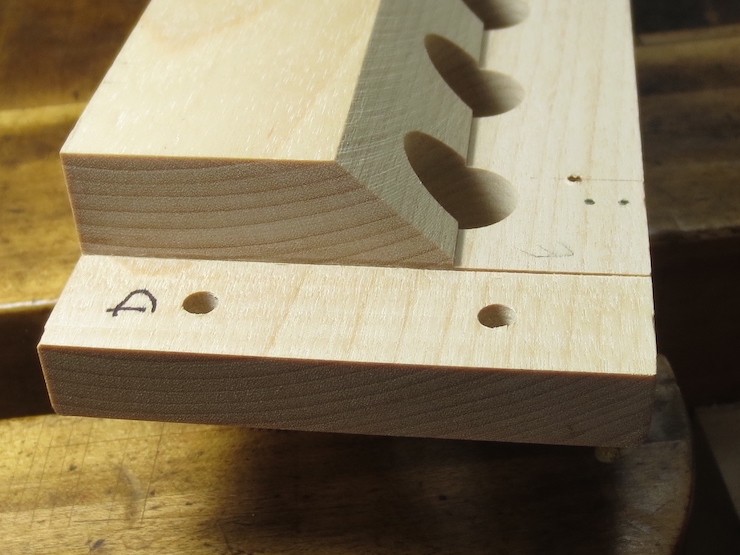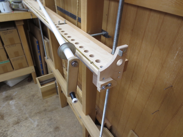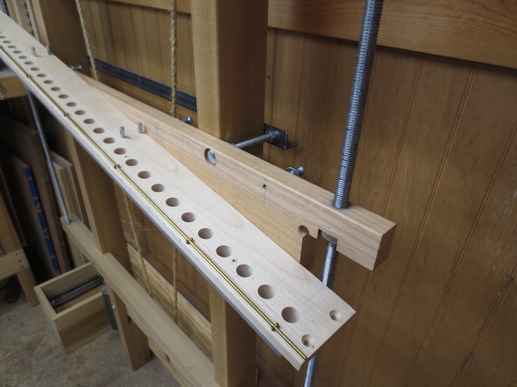 This spindle rack started out as a long piece of yellow birch with a simple rectangular cross-section (3″ wide by 1-1/8″ thick). These pieces should be the same length as the frame cross-pieces and the traveling beam, 42″ in this case. After the large spindle holes were bored two cuts were made on the table-saw to create the shape shown here. The thick back side provides support when screwed to the traveling beam; the front side is narrowed to 1/2″. This is the amount that the (7/8″ tall) spindles are set down into the rack.