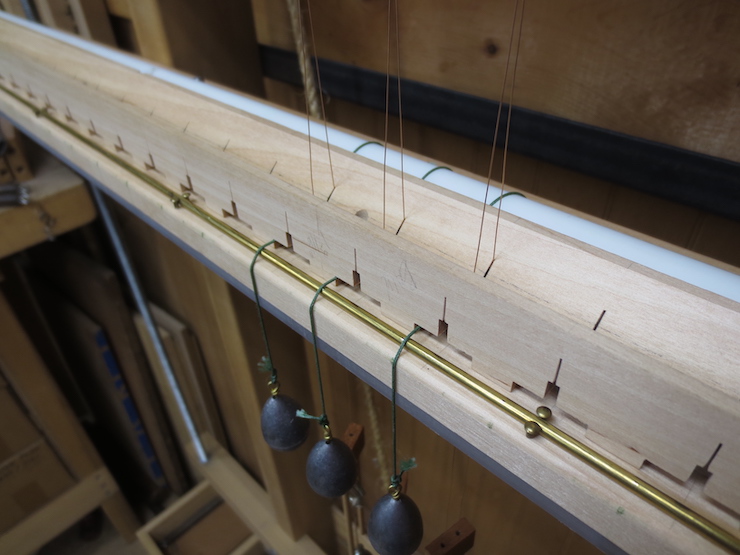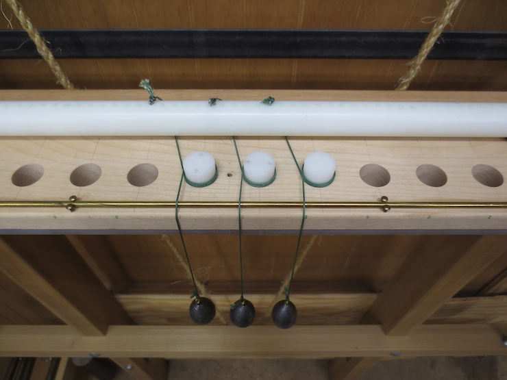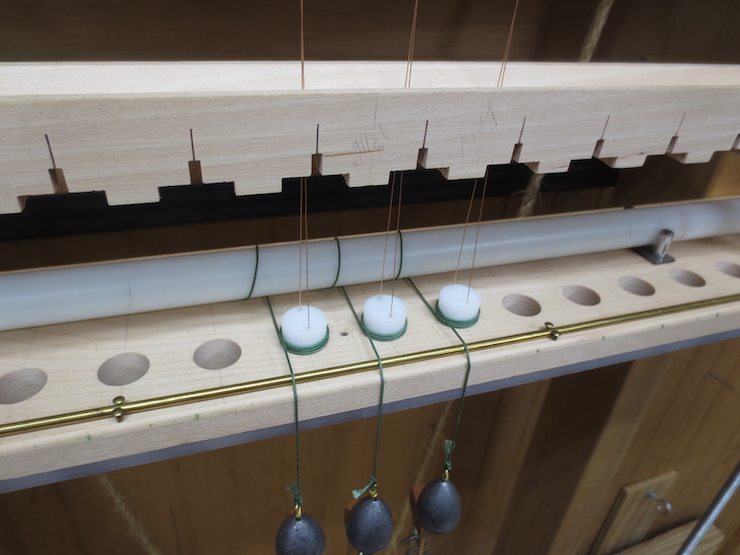 This photo provides a good illustration of the problem mentioned a few photos back. If a weight is bumped from below the loops of cord might loosen and slip off the top of the spindle. This was even more likely with the original spindles which stuck up only 2/3 as far as these do. The more elaborate wire trough I now use prevents this from happening.