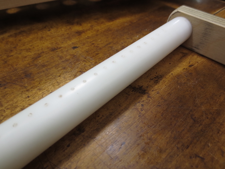The cord reel is made of 3/4″ diameter acetal rod. A line of holes has been drilled into it for nearly its full length. The spacing of the holes isn’t too important. (about 1/4″ is good).