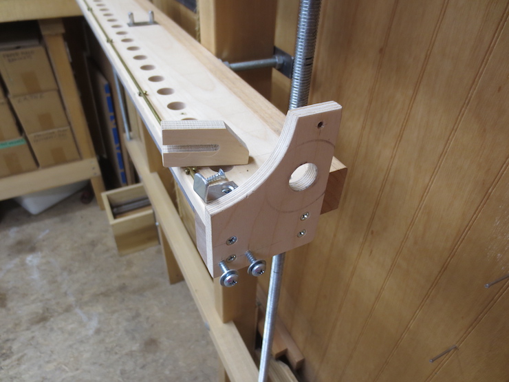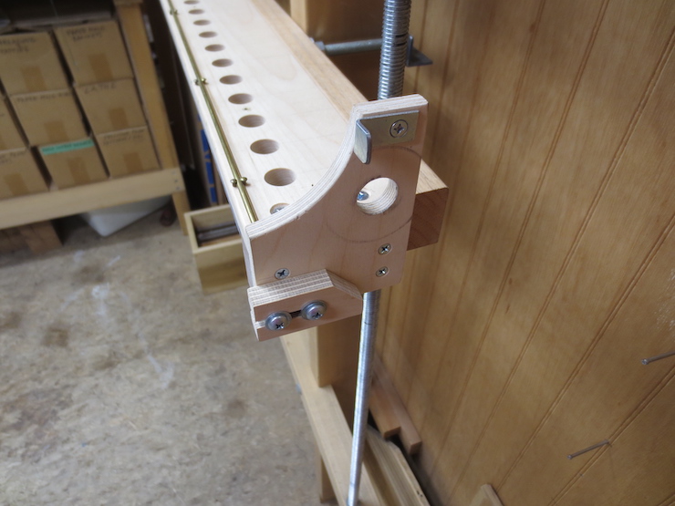 All five of the machine screws have been tightened to firmly attach the spindle rack to the traveling beam. Wood screws could also be used but would be difficult to drive from behind.