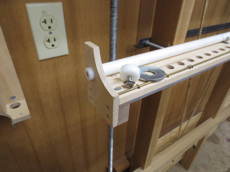 Pairs of screws work as little ‘jacks’ which are adjusted to hold the bottom of the trough just above the spindles. If longer spindles were used (7/8″ or even 1″) longer screws could easily be adjusted to fit. This might solve the ‘cord over the top’ problem mentioned earlier in this post.