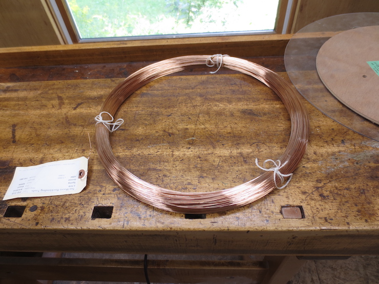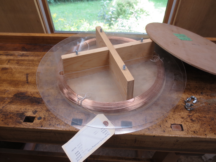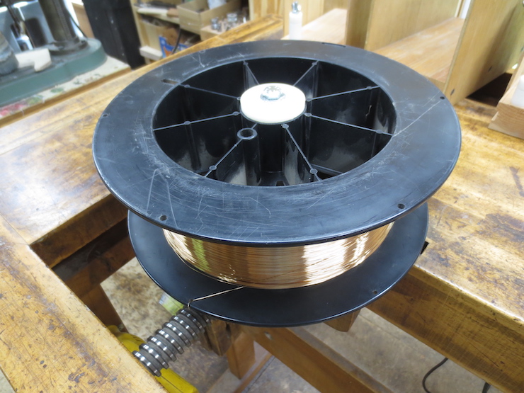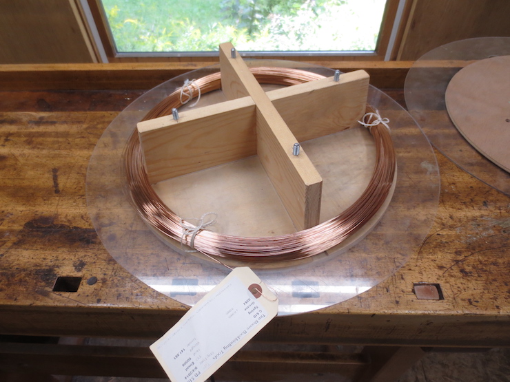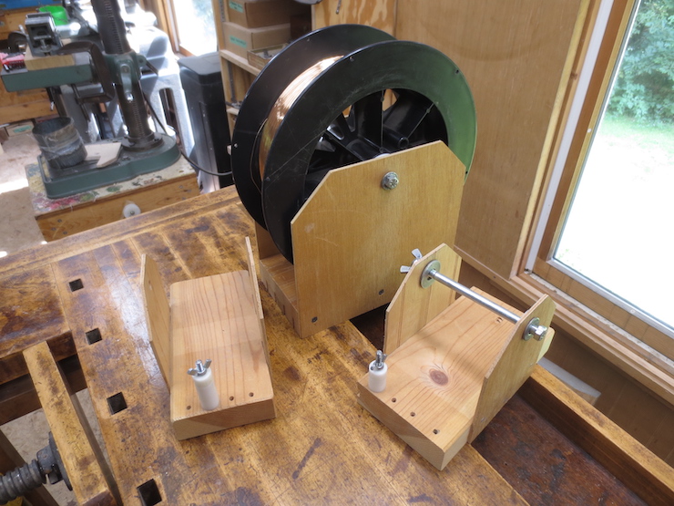 I made two identical plastic discs to fit the reel. The lower one extends the size of the reel to better support the wire. The upper one floats on top of the coil to keep loops of wire from flipping off the top. This is probably not needed, but I had a bad experience early on with a coil that turned into a rat’s nest. A thin plywood disc can be fastened to the top after the wire is in place..