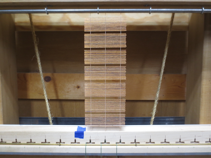 It doesn’t matter exactly how loose the wire starts, it just needs to be a little loose. Notice that the chain and laid wires immediately settle into the spacing dictated by the indexing mechanism of the loom. One or two loose wires don’t matter anyway because a few extra wires are pulled out while fitting the facing to the mould.