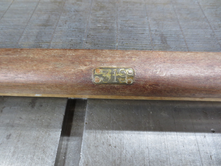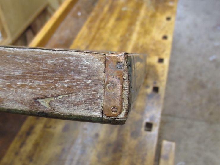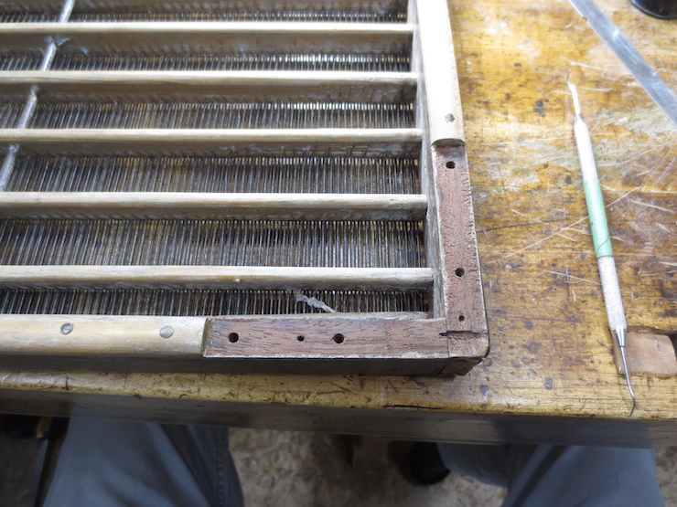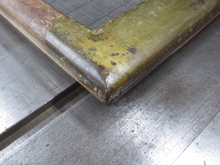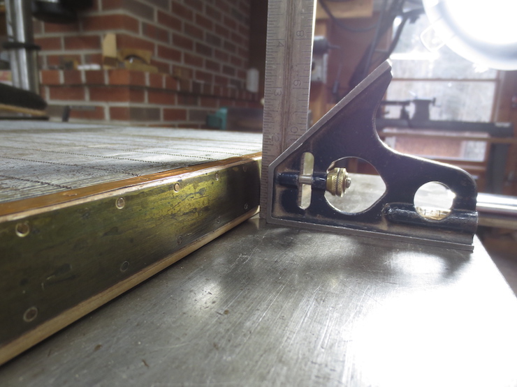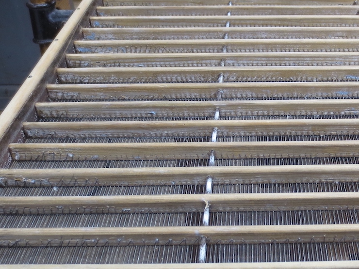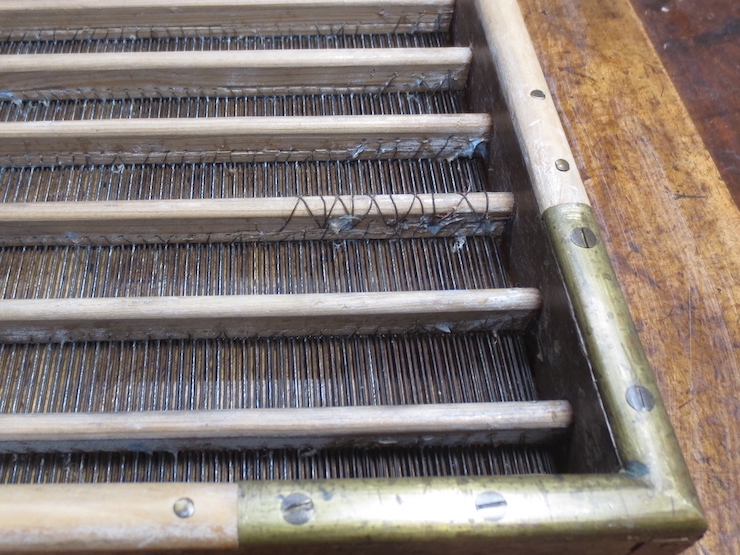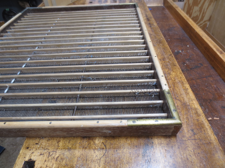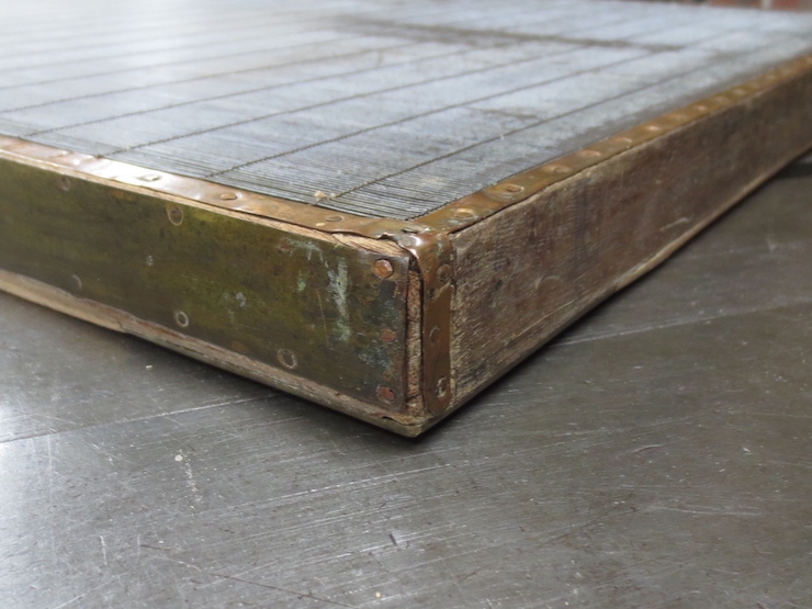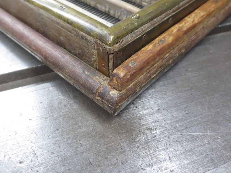 The deckle has extra wide ends. Apparently the moulds were originally built to make larger sheets and this deckle was made with wide overlaps at the ends to reduce the sheet size. The brass sheathing is nailed right down the mitered seams of the deckle corners. I haven’t seen this before.