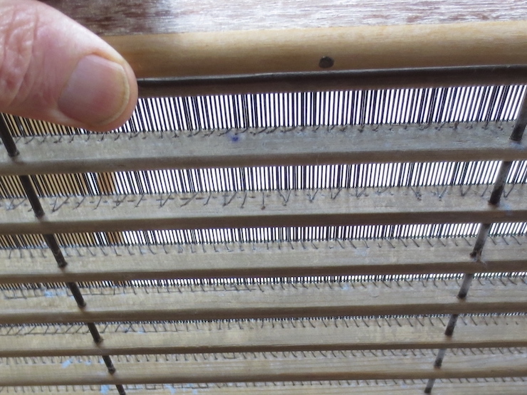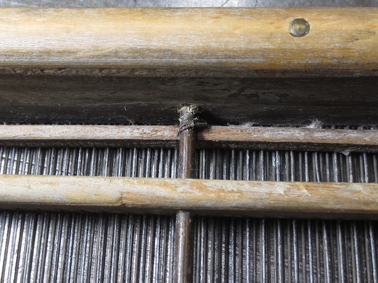 You can see the unusually wide overlap in this view from beneath. This begs the question “what are waterbars for?” since they have been rendered useless here. These little extra ribs appear in all British moulds that I’ve seen. I believe that these were intended to encourage good drainage along the deckle edge. They probably function this way for single faced laid (antique laid) moulds but I think they may be non-functional on double faced moulds, either laid or wove.