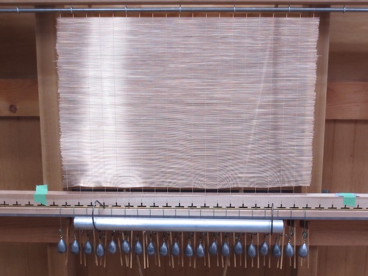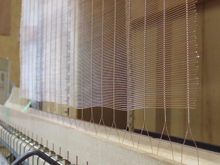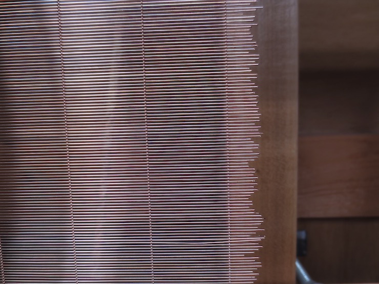 You can see how the wire slides are being pushed down. The wire weights have already been removed. I pulled a few laid wires out after cutting the facing off the loom and found that they can be re-used to make a new facing to replace this one.