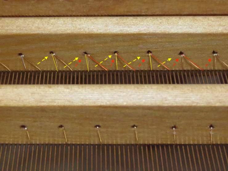 A second sewing wire has been added to the back rib, reducing the average to a stitch for every four laid wires. The dashed arrows show the direction that each wire takes on the back side of the rib. One wire is marked with yellow and the other with red to show how both wires share the same sewing holes but bind the wire facing to the rib at different spots along the chain wire.