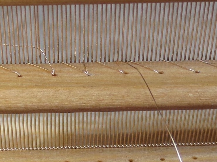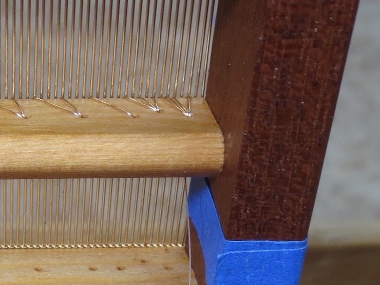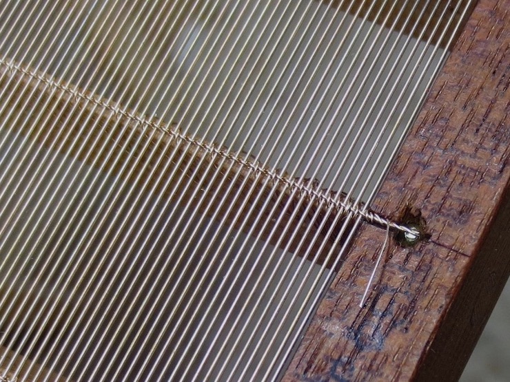 The front rib has been sewn once, following the rib hole spacing (which has been drilled to fit the wire count) to leave a stitch about every eight wires. The stitches are not symmetrical; each falls about two wires away from one hole and must cross about six more wires at a shallower angle to reach the next hole. These angles are reversed for the second wire.