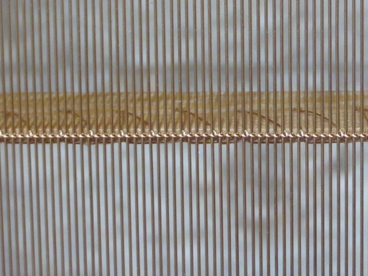 When this second wire reaches the end of a rib the usual pattern of many closely spaced stitches is followed. In this photo the second wire still has a few more stitches to go before it is tied off.