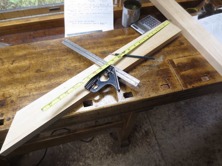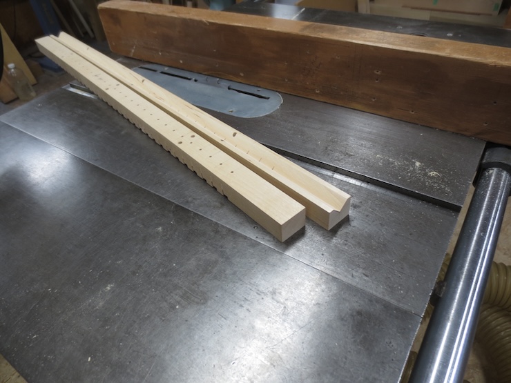 Blanks are prepared with dimensions of 3″ wide and 1-1/8″ thick for the spindle racks and 1-1/4″ wide and 1″ thick for the wire troughs. These should be made with care; straight without twist, sides parallel and angles square. The full-length version (the only kind I’ve made before) uses two pieces cut to exactly the same length (42″ for this loom). I’m trying something new with these two new ones. Both are only long enough to make a mould facing 24″ wide. But the principles are the same and the methods can be used for any length. These two wire troughs are longer than the spindle racks and stick out at each end. This will simply make it easier to feed the laid wires in from the end.