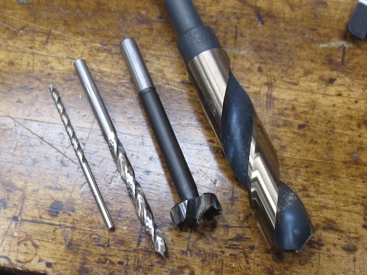 1/8″ diameter and 1/4″ diameter brad point drills, a 3/4″ diameter Forstner and a 3/4″ diameter 135 degree twist drill will be used in making the wire trough.