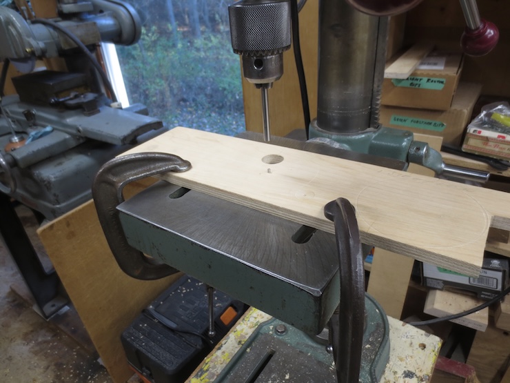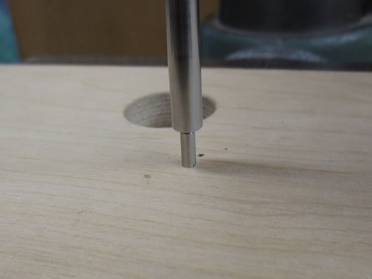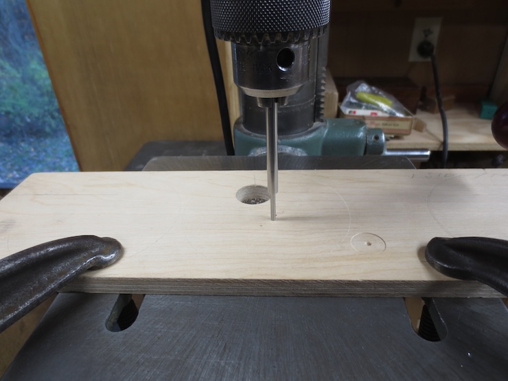 For the drilling operations an index pin must be set in the drill press. A piece of smooth, flat plywood is clamped to the table. Then a 1/8″ diameter hole is drilled partway through with a brad point drill. A number drill a few thousandths smaller is then selected to drill a smaller hole the rest of the way through.