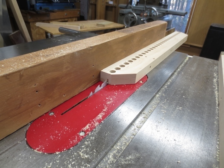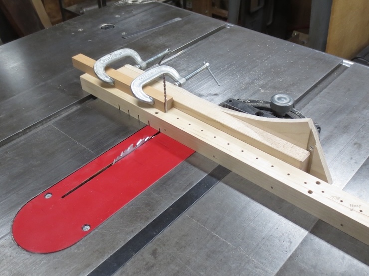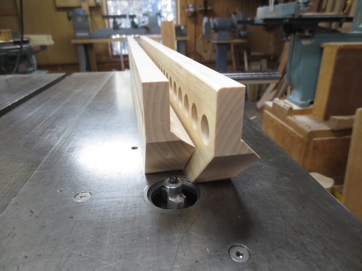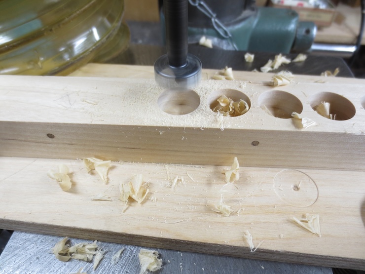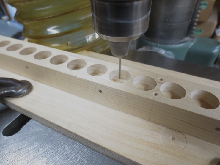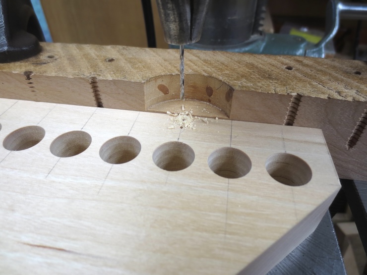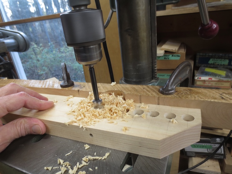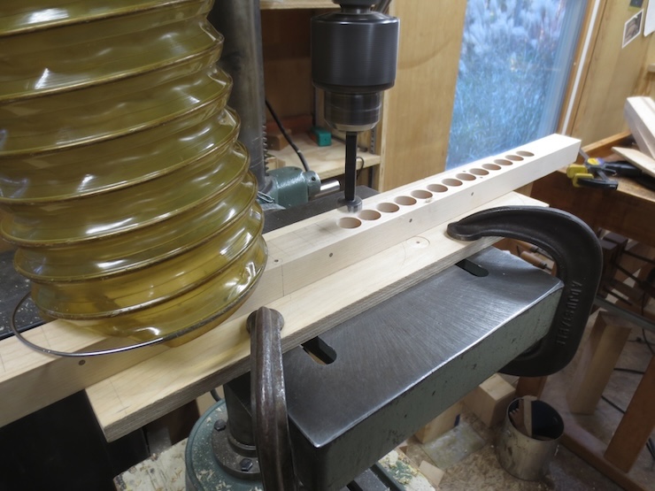The rack is held firmly against the fence and down against the table. A 5/8″ high quality Forstner drill is being used to bore clean holes for the spindles to turn in.