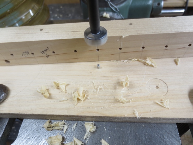 A 1/2″ brad point drill has bored a blind hole in the bottom of the spindle rack.
