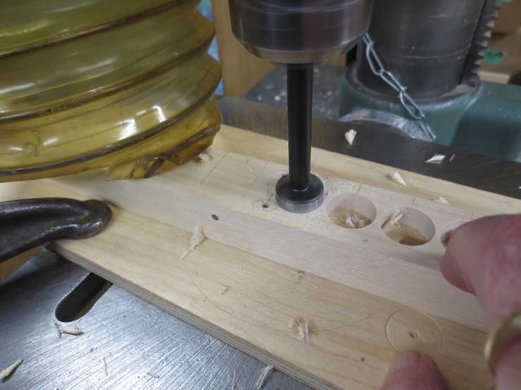 Forstner bits leave a flat bottomed hole. To give the wires room to twist above the spindles a shallow cone-shaped space must be drilled into the flat ‘bottom’ of each hole (which will become the top when the part is turned right side up). This conical space does not need to extend all the way to the sides since the wires leave the top of the spindles less than 1/2″ apart. A narrow rim around the edge of the hole is left flat.