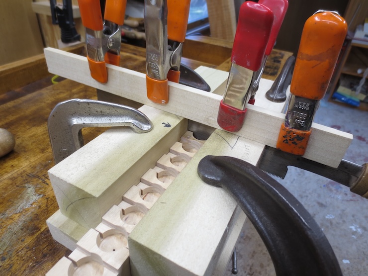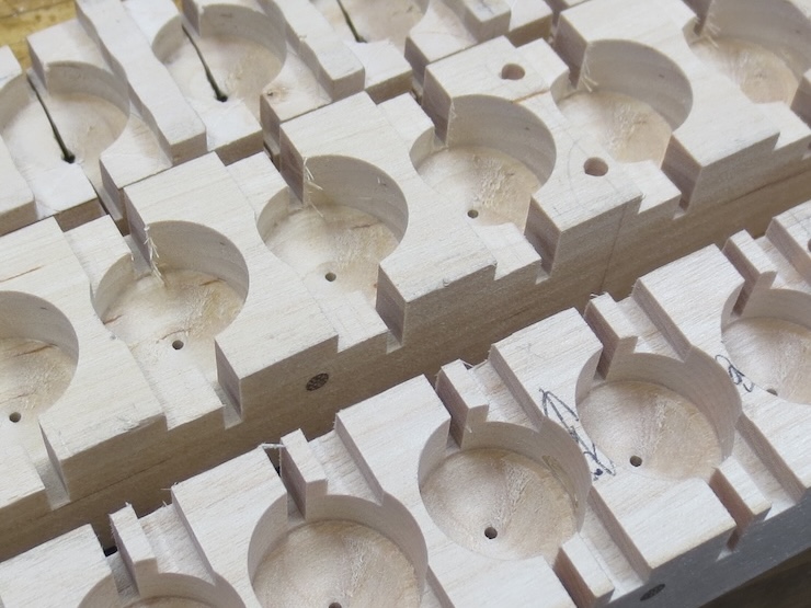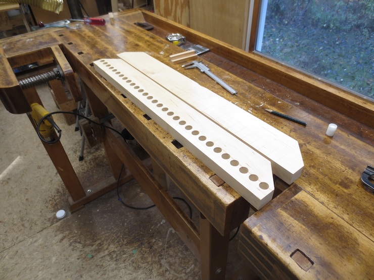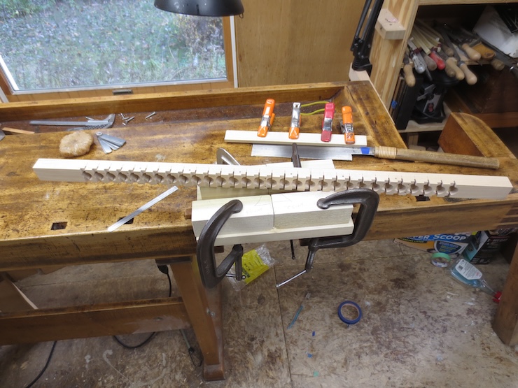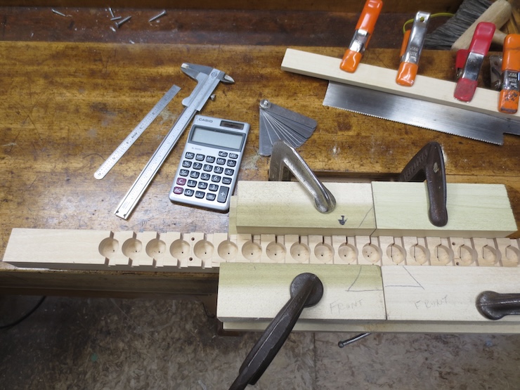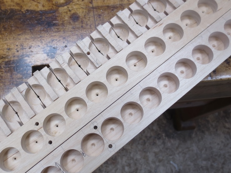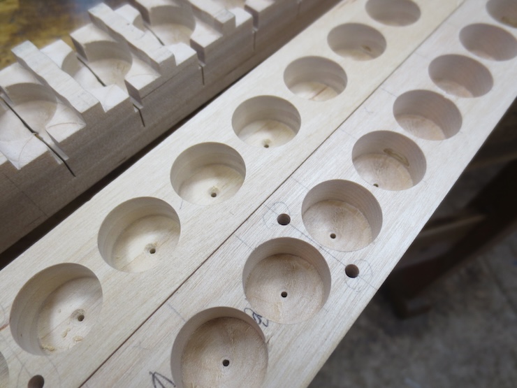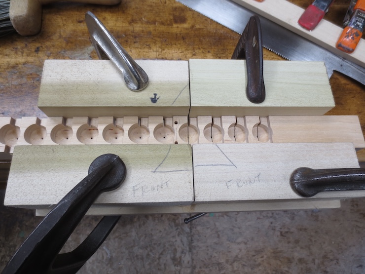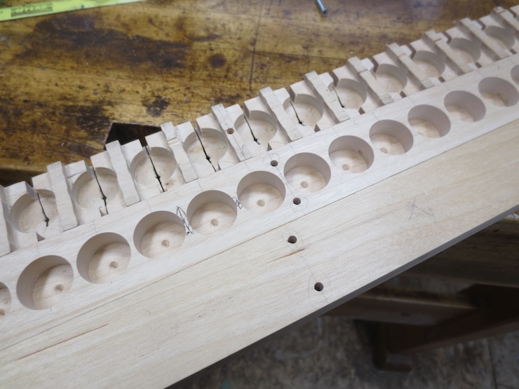 Earlier on I put in 1/8″ diameter dowels cross-wise every four spaces to strengthen the parts so they wouldn’t crack between the large holes. The dowels were driven into the drilled holes without glue. You can see the end of one of the in the photo above and five in the photo above that one.