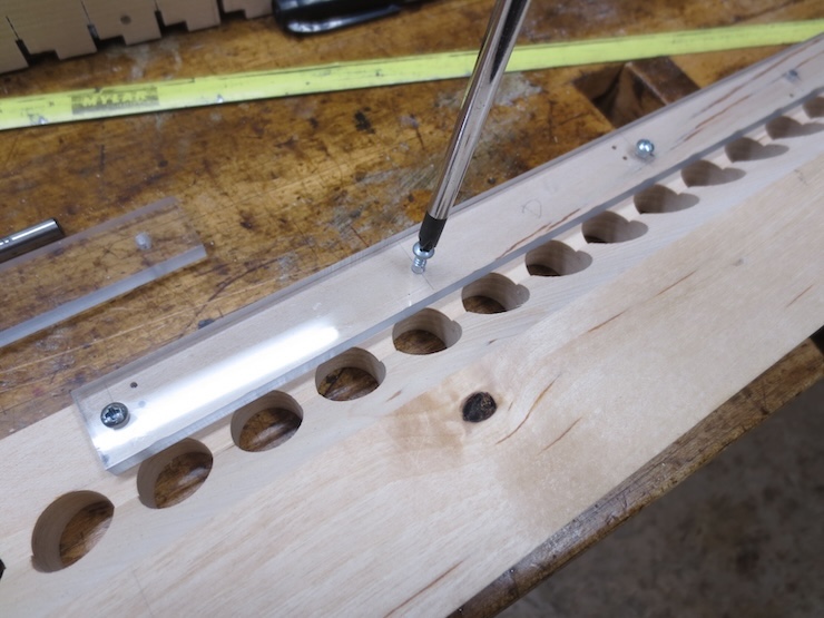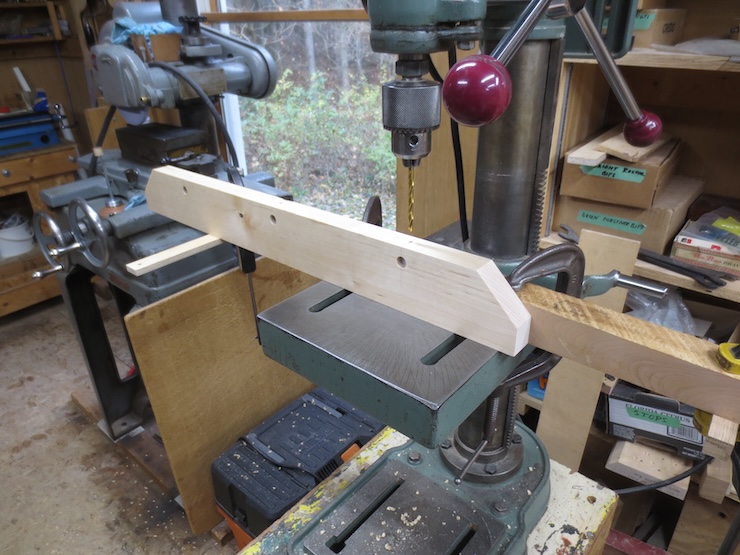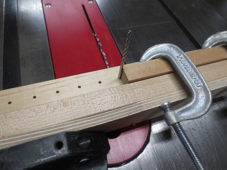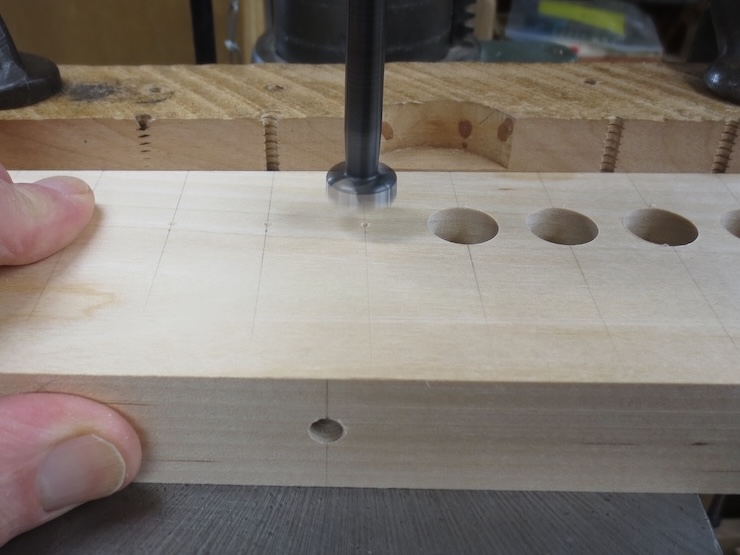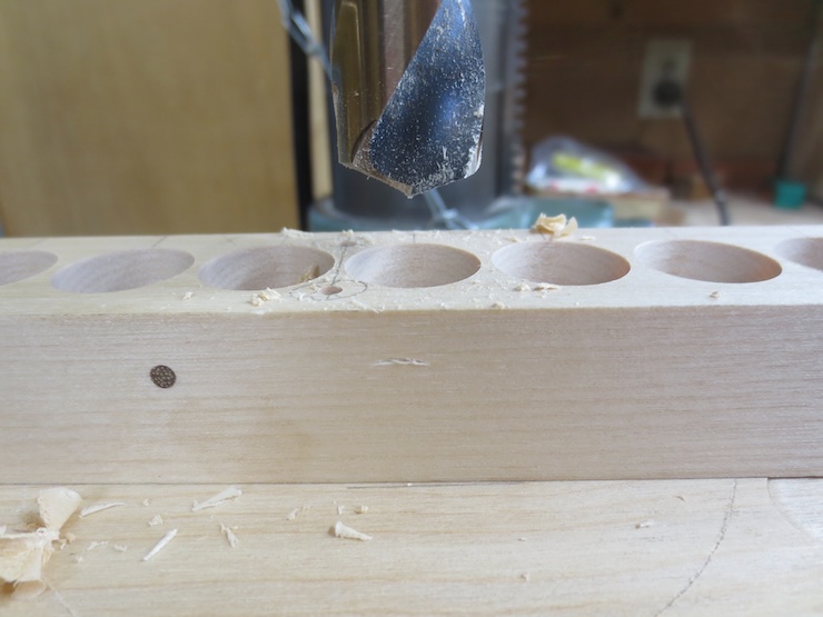 A fence is clamped to the drill press table to drill a line of holes centered exactly 1″ from the front of the spindle rack. The holes aren’t drilled all the way through since part of the front will later be cut away. If you look closely you can see that I pre-drilled tiny starting holes with a very small drill/countersink. This made it easier to get the holes centered right on the marks. The points of these wide, flat Forstner drills are not easy to see.