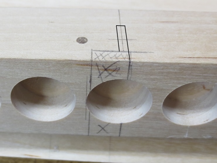 For each spindle location this area needs to be removed from the bottom of the wire trough to make space for the weighted cords that will drive the spindles. The narrow part indicated in black will be removed first; it is the start of hand sawn wire engagement slots that will be cut further up into the trough.
