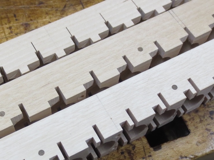 Multiple cuts are made to creat the shallower part of the notch. It makes room for the weighted cords that drive the spindles but also prevents the cords from ‘riding up’.