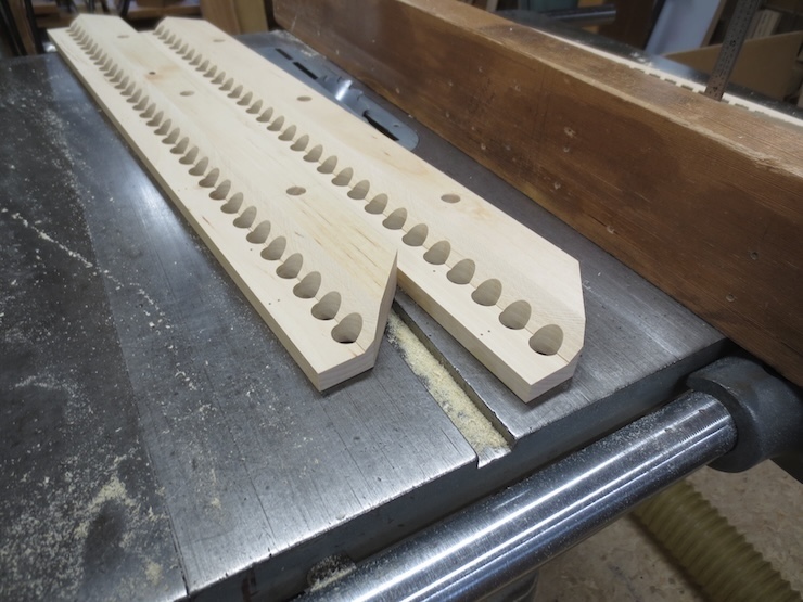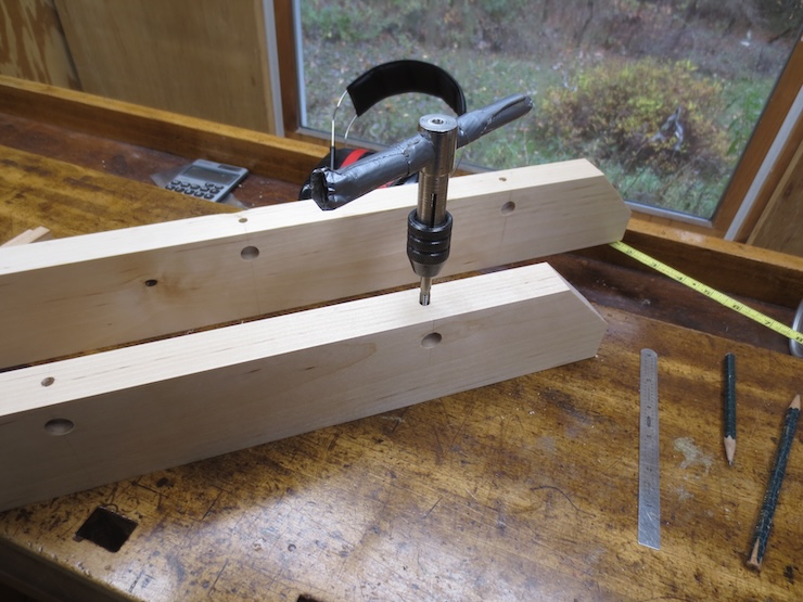 These clearance holes are very close together for the new twisting mechanisms. This is about as close as 5/8″ spindles can get without seriously weakening the wooden parts that hold them.