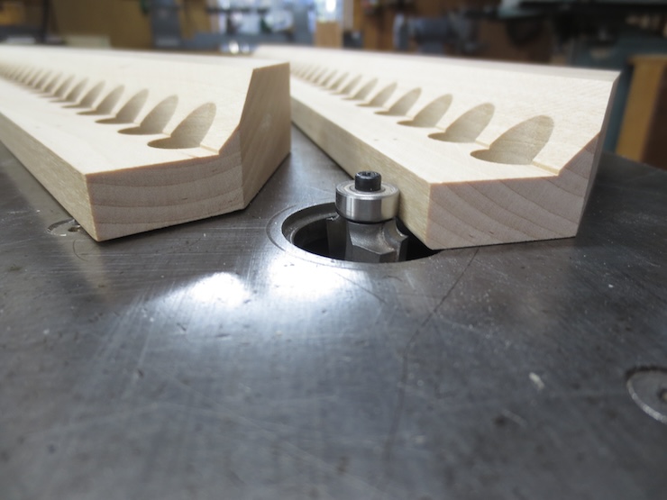 The reason the wire troughs have such an elaborate shape is simply to prevent the weighted cords from slipping off the tops of the spindles during use. This is a real headache when it happens. The extra time and trouble taken in making this design are well worthwhile. These 3/4″ diameter holes leave plenty of room for the cords to wrap around the sides of the 5/8″ spindles. Since the clearance holes completely cover the spindles notches will be cut to allow room for the cords in a later step. The tops of these notches will be just above the cords to prevent them from shifting upwards if the lead weights are accidentally bumped.