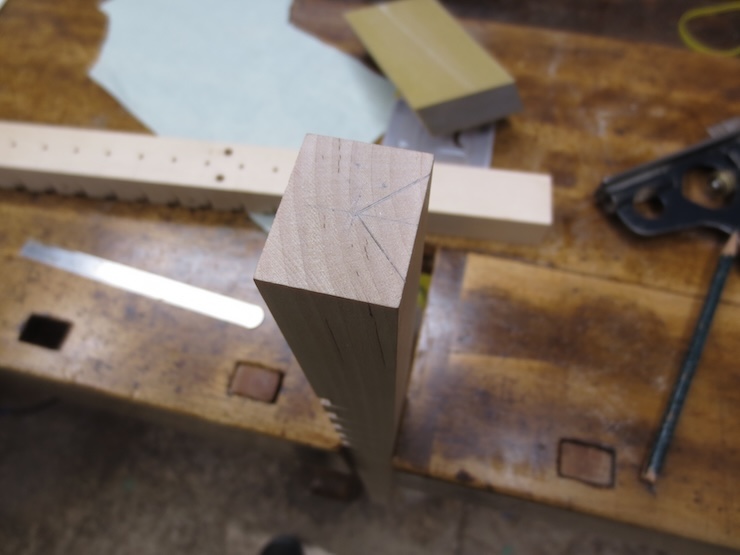 A partially sawn blank with some of the tools that are used. A strip of wood is clamped to the top of the Japanese style saw to stop the cut at the right depth.