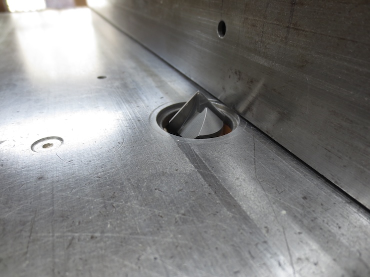 The drill that was embedded in the drill press table as an indexing pin has been removed and is now used to index slots being cut on the table saw.