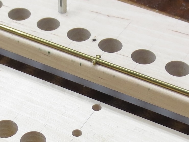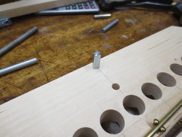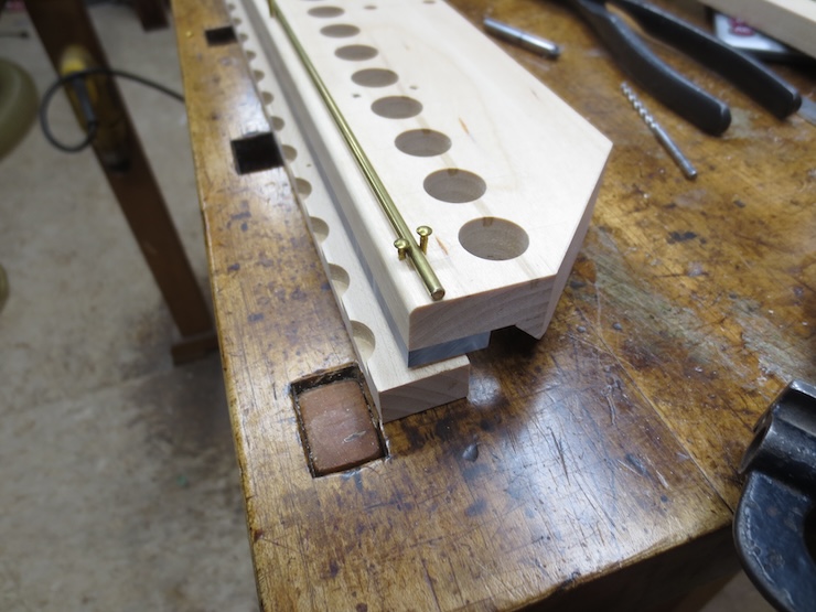 Later on brass escutcheon pins will be driven into the holes to secure the rod as shown above.