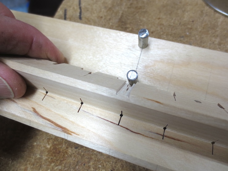 Once again, the indexing holes prove invaluable! A rounded bit of brass rod sticks up from the middle of this crude sawing jig and will be used to locate the saw cuts precisely.