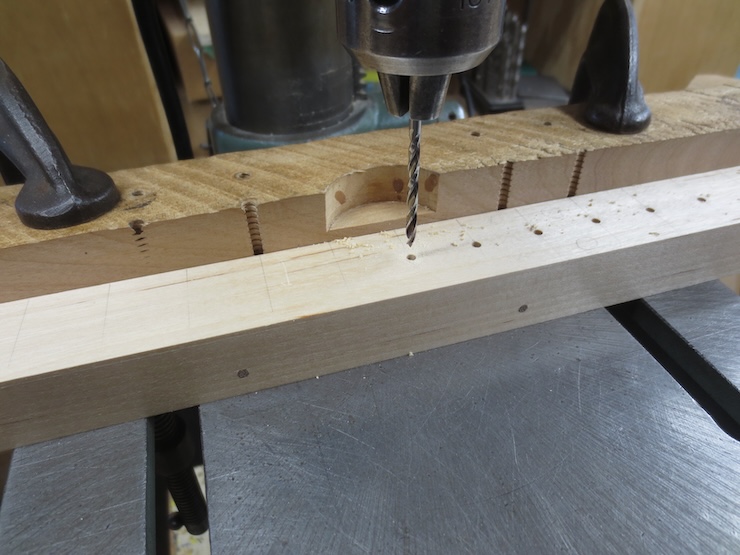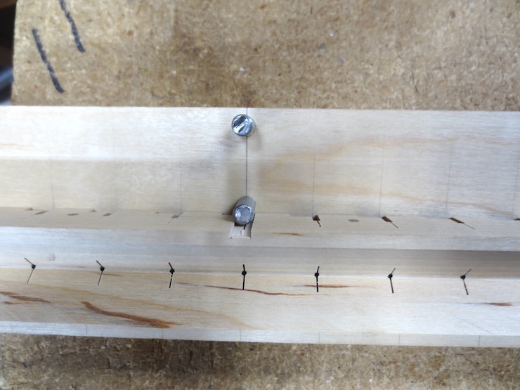 I next drill 1/16″ diameter holes a little deeper into the wood. Later these will show as a small opening where the V groove of the wire trough intersects the conical spaces over the spindles. The small holes will be also used to help gauge the fine saw cuts which will be made to create the wire engagement slots.